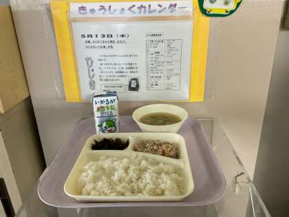 さけのごまみそ焼き 五目汁 ひじきのいため煮 ごはん 牛乳