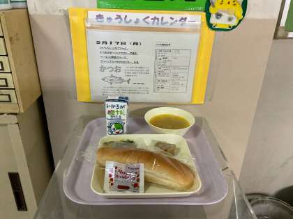 かつおのガーリックマヨネーズ焼き ベーコンと野菜のスープ グリーンアスパラガスのソテー 大型コッペパン(いちごジャム) 牛乳