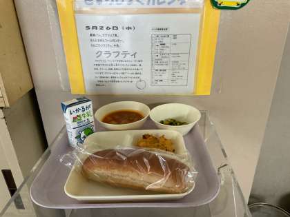 ケチャップ煮 さんどまめとコーンのソテー りんごのクラフティ 黒糖パン 牛乳