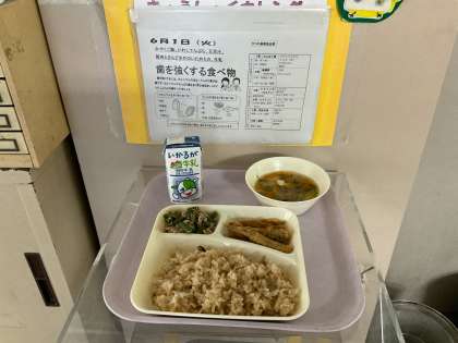 いわしてんぷら 五目汁 豚肉とさんどまめのいためもの ごはん 牛乳