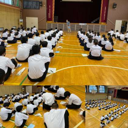 今、2年生(60期生)はキャリア学習に取り組んでいます。昨年1年生の時には「職業レディネステスト」にチャレンジし自分を知ることややってみたい仕事について触れました。本来なら2年生のこの時期に「職業体験学習」として地域にある職場に2日間お世話になる予定でしたが、新型コロナウイルス感染症の影響で昨年の59期生同様に中止となってしまいました。そこで、今年は「職業調べ」やゲストティーチャーの方にお願いして「SPトランプ」の講話や体験、また道徳の授業として「加奈子の職業体験」等について取り組んでいくこととしました。今日はその第一歩で「人はなぜ・どうして・何のために働くのか」など体育館で6時限目に「キャリア学習」プリントを使って学んでいました。自分の将来を考えていくうえで、「職業に就き」人生の多くの時間を過ごすには「自分の良さや個性を知ること」や「働く意義や目的を考えること」が大切なのです。60期生の皆さん、一人ひとりが自分の夢の実現に一歩でも近づくことができるようになってほしいものと期待します。