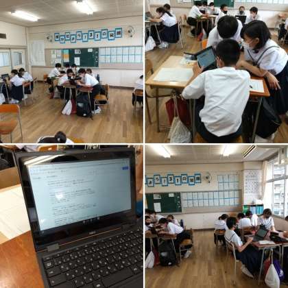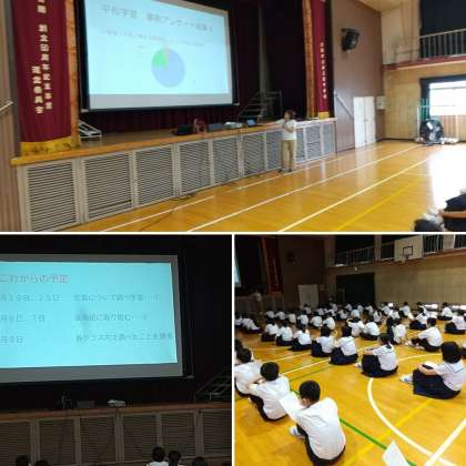 今日(18日)、1年生は昼からの5・6時間目に平和学習を行いました。5時間目は学年全体で取り組みの説明があり6時間目は実際に起きた日本での戦争について各クラスで班を作りテーマごとについて調べました。班によってはPCを使いいろいろな情報を検索しメモをとっていました。今後は今日の情報を基に新聞作りを計画しています。文化発表会等で見てもらう機会があればうれしいですね。