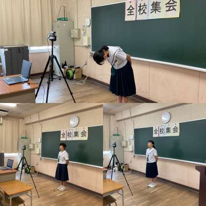 今日(21日)のオンライン全校集会ではいつも通り校長先生の話の後に図書委員会から話がありました。前回の図書委員会で本の貸し出し冊数が増えたことが分かったことと同時に本を返さない人も増えたことが分かりました。よって今月の残りから7月の目標を「借りた本はすぐに返そう」としました。図書委員から呼びかけをしますが本を借りた人は定期的に貸出期間をチェックするようにしましょうとありました。続いて体育委員会からの連絡で、最近暑くなってきて熱中症のリスクが高まっています。外での授業では帽子の着用が許可されていますので、使用する場合はキャップ型の帽子を着用するようにしましょう。また、休憩時に水分補給ができるように水筒とタオルを持ってくるようにしましょう。一人ひとりの心がけで健康に活動することができます。熱中症にならないよう注意しましょうと呼びかけがありました。