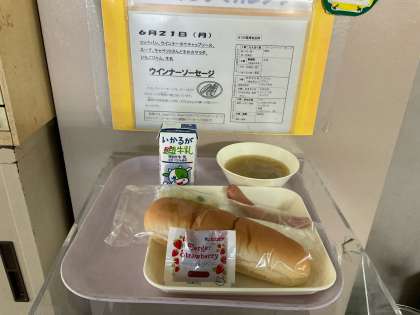 ウインナーのケチャップソース スープ キャベツとさんどまめのサラダ 大型コッペパン(いちごジャム) 牛乳
