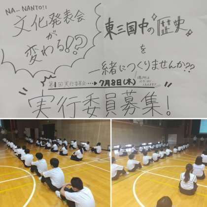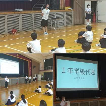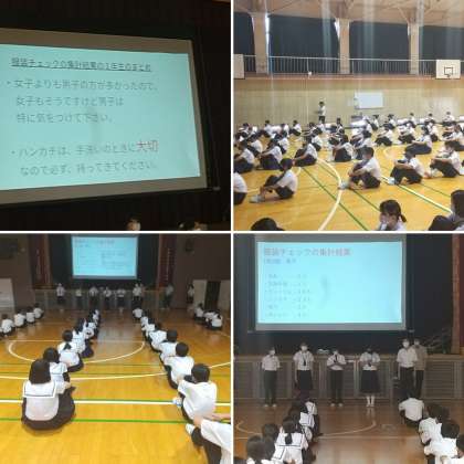 今日は1年生の学年集会を行いました。パワーポイントを使い学代委員会、風紀委員会、体育委員会より連絡がありました。今月の学年目標は「時間の使い方を考えよう」です。授業中の私語を減らす、行動を早くする等の呼びかけがありました。また風紀委員会からはハンカチやティッシュ、身だしなみについての話。体育委員会からは体育大会のクラスカラーが決まりましたとの連絡がありました。学年の先生からは文化発表会のクラス委員を募る連絡もありました。そして今日から期末試験1週間前。前回は4教科でしたが今回は8教科です。日々の学習の振り返りをしっかり頑張りましょう。