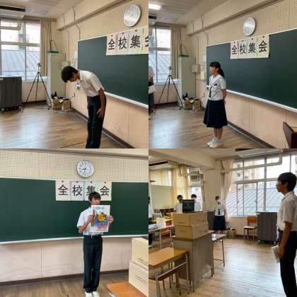 今日(5日)のオンライン全校集会では校長先生の話の後に体育委員会からの連絡がありました。これから始まる水泳の授業に対して、水泳は体育の授業の中でも危険な単元なので「プールでの事故を無くすため、今以上に授業をしっかりと受けよう」と今月の目標を掲げ、呼びかけがありました。水泳歴が長くても短くても先生の話をしっかりと聞いていないと大きな事故につながりますので、一人ひとりが先生の話を聞いて楽しい水泳の授業にしましょうとありました。続いて、生徒会からは2つ話がありました。1つ目は7月の品格教育のテーマ、「継続」についてでした。スポーツや勉強、何事においても継続することは大切なことで、勉強を毎日少しずつでも続けていれば、定着しものを覚えることができるようになります。頭の中であれがしたいこれがしたいと考えることは簡単ですが、それを実行に移し、続ける努力をすることが大切です。今、自分が頑張っていることや新たに頑張ろうとしていることを継続するということを意識して行動するようにしましょうとありました。2つ目は「第2回いじめアンケート実施について」の話でした。生徒会はいじめをなくすということを目標に「いじめ防止の木」や「スローガン」、「いじめ防止のポスター」作成など、いろいろなことに取り組んできました。それらの活動を通して、いじめが減ったのか確認するためにアンケートを実施することにしました。質問は「1学期にいじめを受けたことがありますか」「1学期にいじめを見たことがありますか」の2つです。皆さんのご協力をお願いしますとありました。2学期へ向けて1学期のまとめ大切ですね。