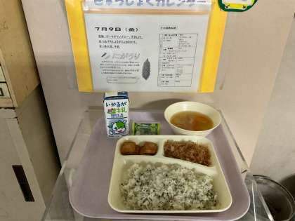ゴーヤチャンプルー すまし汁 あつあげのしょうがじょうゆかけ まっ茶大豆 ごはん 牛乳