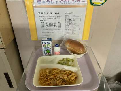 チキントマトスパゲッティ グリーンアスパラガスとキャベツのサラダ 発酵乳 黒糖パン(1/2) 牛乳