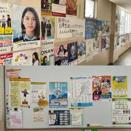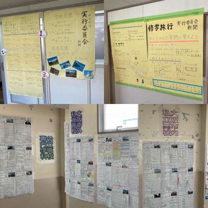 写真は3年生の学年フロアーに掲示されている修学旅行実行委員会による新聞と1学期に取り組んだ調べ学習「高校調べ」の新聞、高校からのポスター等です。懇談の折、ご鑑賞いただければ幸いです。