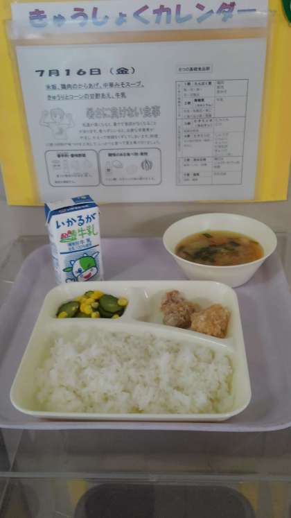 鶏肉のからあげ 中華みそスープ きゅうりとコーンの甘酢あえ ごはん 牛乳