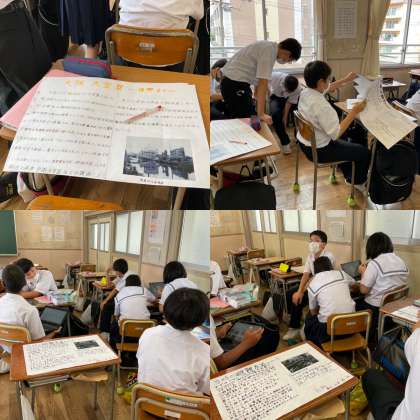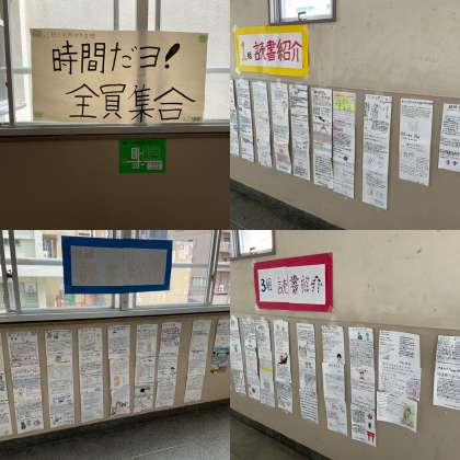 写真は1年生の学年フロアーに掲示されている「読書紹介」と「平和学習の取り組み」の様子です。読書紹介では一人ひとりが自らおすすめの一冊の本を紹介するためにまとめたポスター掲示となっていますので懇談の折、ご鑑賞いただければ幸いです。