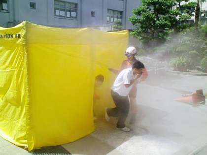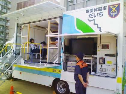 この写真は、起震車による「震度7」体験と、煙体験ハウスです。ハウスの中では煙により方向感覚がなくなり出口が見つからない状況になり、火災時の煙の怖さを体験できます。
