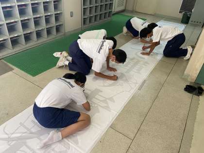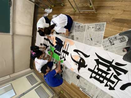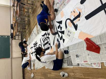 しかしながら、1学期終業式でもお話をしましたが、応援合戦は残念ですが昨年度同様に中止とします。ただし、今年は競技種目に新たなものが追加される予定です。楽しみにしてほしいものです。そんな中、1学期に決定した体育大会のスローガン「汗と笑顔で輝け青春」の垂れ幕を今週に入って生徒会と体育委員、美術部の仲間が協力して作成しています。 暑い中、みんなのためにありがとう。