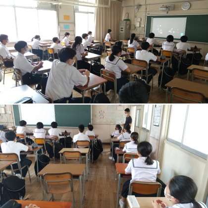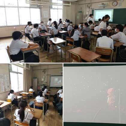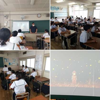 連日の猛暑が続きますが今日は1年生の学年登校日。夏休みの学習状況の確認、本日しめきりの宿題の提出や1学期より取り組んでいる反戦平和学習のまとめを行いました。平和学習では各クラスでDVD「蛍の墓」を視聴しました。始業式は8月25日になります。今日はクラスの一人一人の元気な顔をみることができて良かったです。残りの夏休みも家庭学習、部活動、家族との思い出作り等充実した夏休みをおくって下さい。