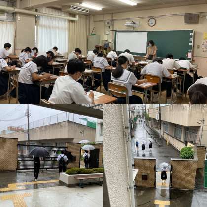今日(17日)は3年生の登校日でした。朝から強い雨が降っていましたが、生徒たちは久しぶりの教室で元気に過ごしていました。あと1週間の夏休み、課題をしっかりと仕上げて25日(水)の始業式も元気に登校できるようにしておきましょう。