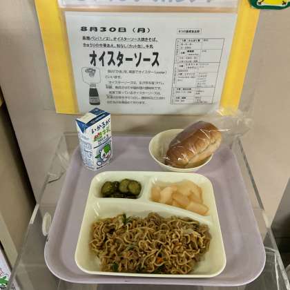 オイスターソース焼きそば きゅうりの中華あえ 和なし(カット缶) 黒糖パン(1/2) 牛乳