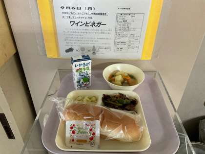 牛肉の香味焼き スープ煮 サワーキャベツ 大型コッペパン (りんごジャム) 牛乳