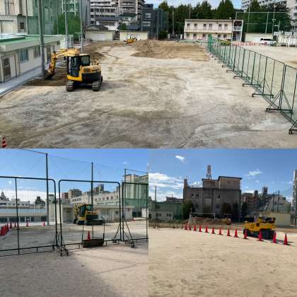 今日(21日)から運動場を分断していた工事エリアの整地のために重機が入って作業をしています。この作業が終われば次に進むことができるのですが…引き続きご協力をよろしくお願いします。