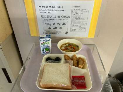 あげぎょうざ 中華煮 ぶどう(巨峰) 食パン(いちごジャム) 牛乳