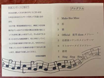 今日(2日)、午前10時45分から限られた時間で、限られた人たちをお招きして吹奏楽部の引退コンサートが体育館で行われました。昨日実施した子どもたちだけの文化発表会、舞台発表で頑張ってくれた吹奏楽部の仲間たちの活躍をぜひ部員の保護者の方に見てもらい応援していただきたいという顧問の先生の思いと緊急事態宣言解除ということもありコンサート会場への入場限定での演奏会を認めました。足をお運びいただきました皆様、本当にありがとうございました。コロナ禍で、練習時間に大きな制限があった中での演奏会、予定していた8曲、そしてアンコールの声にも応えてくれ最後まで頑張ってくれた吹奏楽部の仲間たち、お疲れさまでした。3年生はこれで引退となりますが中学校時代に頑張った部活動の想い出は永遠に忘れないことでしょう。