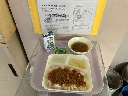 タコライス もずくのスープ 焼きじゃが まっ茶大豆 牛乳
