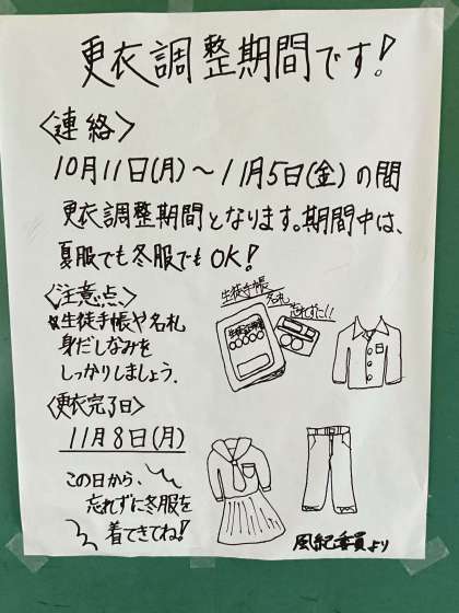 週明け月曜日(11日)はリモートによるオンライン全校集会です。時間ぎりぎりで登校してくる人は、時間に余裕をもって行動するよう常に心掛けてほしいものです。また、風紀委員からすでに更衣調整期間のお知らせポスターが廊下等に掲示されていますが、冬服への更衣調整期間が来週から始まります。調整期間中は、体感にあわせて夏服と冬服のどちらでも構いません。