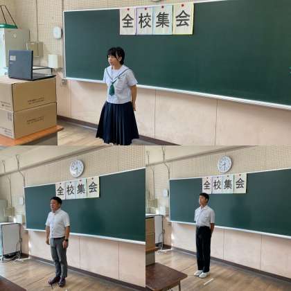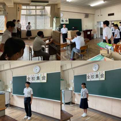 いつものように校長先生のお話の後、生徒指導主事の先生からグランドににがりを撒いたので今日一日は使用不可との連絡があり、昼休みなどは図書館の利用や教室などで過ごしましょうとのことでした。続いて、美化委員会からのお知らせとして、新委員長より頑張りたいこと2点についてのお話がありました。一つ目はこの学校が来校者から綺麗ですねと言ってもらえるようにすること。二つ目はケガを減らすということ。ぜひ皆さんの協力で頑張っていきましょうと力強い言葉がありました。また、「校内美化に務め学校生活を楽しもう」という後期の目標、「置き勉をゼロにしよう。」という今月の目標について具体的方策を示し、勉強のしやすい机を作っていきましょうと呼びかけがありました。次に風紀委員会より新委員長から後期の目標「前期の目標を頭に残して、遅刻をゼロにしよう」と今月の目標「身だしなみをしっかり整えよう」、具体的方策として「注意し合おう」とありました。また、今日から更衣調整期間ですとの連絡もありました。最後に生徒会から今日の放課後の部活動部長会議についてありました。来月実施の体育大会部活動対抗リレーについて話し合いがあるので2年生の部長ではなく3年生の部長が出席するようにしてくださいとのことでした。