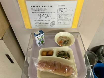 黒糖パン はくさいのクリーム煮 あつあげのごまじょうゆかけ 豚肉とさんどまめのオイスターソースいため 牛乳