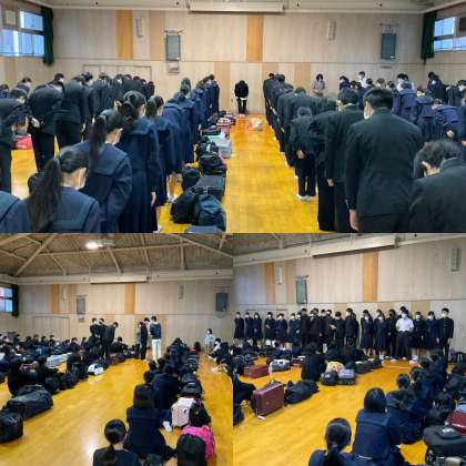 おはようございます。コロナ禍ではありますが緊急事態宣言の解除もあり、今日(14日)から59期生の修学旅行が始まります。1泊2日感染症対策を万全に皆で楽しんできましょう。早朝6時半に格技室に集合し、検温をすませてから出発式を行っています。