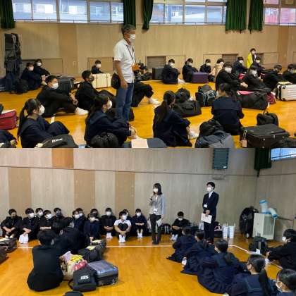 出発式では修学旅行の目標コールを代表の生徒が行い、校長先生の話のあと、同行していただく添乗員さん・カメラマンさんの紹介、実行委員会から取り組みに関する話がありました。