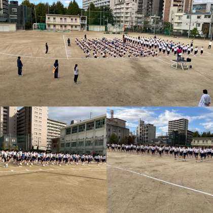 今日(18日)、6時限目運動場で体育大会の全体練習を行いました。運動するにはちょうどいい気温で、元気よく集合体形やその場足踏み、行進練習などを指示に従い、一つ一つ確認をしながら練習をしていました。体育大会当日までちょうど2週間、各自出場する競技種目を全力で行えられるよう体力向上をお願いしたいものですが、ケガには十分注意しましょう。運動前のアップとクールダウン、運動後の汗の処理は基本です。