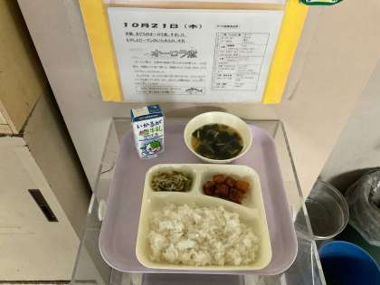 まぐろのオーロラ煮 すまし汁 もやしとピーマンのいためもの ごはん 牛乳