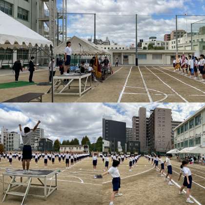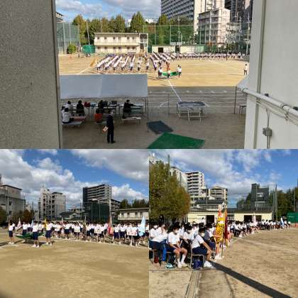 昨日(28日)、係生徒が中心となり会場準備を頑張ってくれた運動場にはきれいにラインが引かれ、朝から用具の準備も万端です。さあ、予行を始めましょう。入場行進と開会式、吹奏楽部による校歌演奏、開会式では教頭先生から激励の言葉をいただきました…
