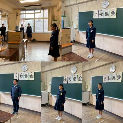 最後に生徒会からの連絡として、各学年の廊下にすでに学級旗の写真が貼っていますが、明日の体育大会の学級旗の投票に活用しましょうと声を上げていました。