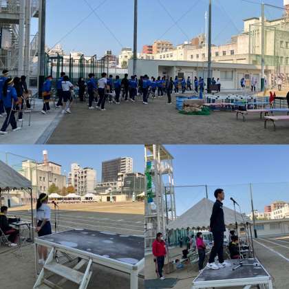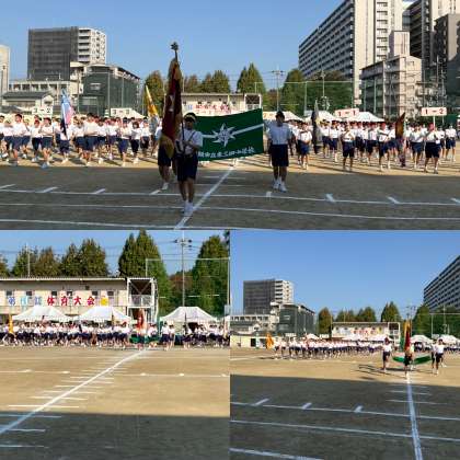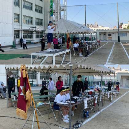 生徒たちは教室から椅子を持って運動へ集合、朝の声出しをして教頭先生の開会宣言で入場です。放送係ご苦労さま。