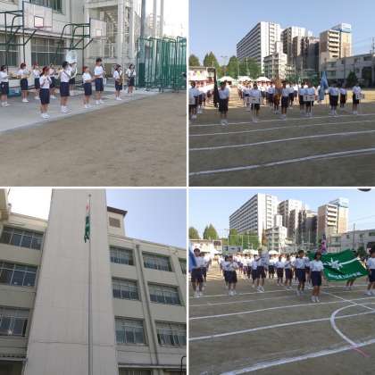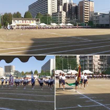 入場行進が行われています。校長先生からの言葉の後、3年生体育委員の力強い選手宣誓が行われています。