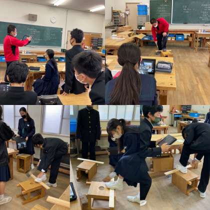 技術では技術室で1年生がのこぎりを使って安全に木材を切る方法を学んでいました。一人一台端末(タブレット)を活用してグループで動画撮影をしながらお互いに切り方の検証をしていました。