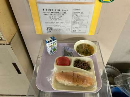 牛肉のオイスターソース焼き 中華スープ りんご ミニフィッシュ レーズンパン 牛乳