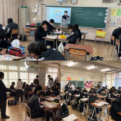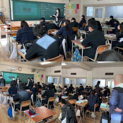今日(11日)も先生たちの授業相互参観が続いています。3時限目の英語の授業と4時限目の社会の授業を参観しました。どちらも3年生の授業ということもあり、一人ひとり真剣に授業を頑張っている姿が印象的でした。なお、3年生は週明けの月曜日から木曜日まで授業を午前中で終え、給食後下校、午後から進路懇談を予定しています。皆さん そろそろアクセル全開で、より一層頑張りましょう。