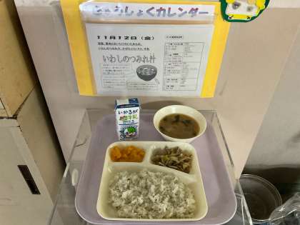 豚肉とまいたけのいためもの いわしのつみれ汁 かぼちゃういろう ごはん 牛乳