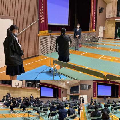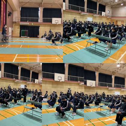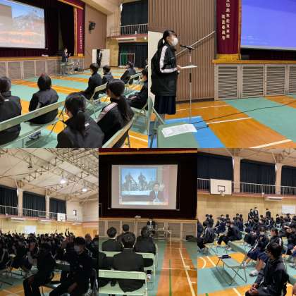 今日(12日)、5・6時限目に体育館でフリーランスジャーナリストの西谷文和さんから「戦火の子どもたちに学んだこと アフガン、シリア戦争を取材して」というテーマでお話を伺いました。1年生で沖縄戦について学び、2年生では平和に貢献した人々について調べ学習をし、ポスターにまとめ、発表会をしました。今、現実に世界のどこかで戦争や紛争が起きている状況の中、平和のために私たちができることは何かを知るヒントを頂ければということでの取り組みでした。講師の西谷文和さんはイラクの子どもを救う会の代表をされ、何度もアフガニスタンやイラク、コソボなど中東に入り現地取材を行ってきたときの様子の映像やアフガニスタンで今は亡き中村哲さんとの交わしたお話などを分かりやすくしてくれました。ご講演の終わりには生徒たちからの質問がたくさん出て、一つひとつ丁寧にお答えを頂けました。