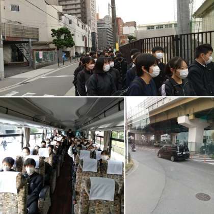 代表生徒の司会進行で出発式を行っていました。その後、学校の北側に駐車しているバス3台にクラスごとに分かれて乗車、京都へ出発進行… バスのドライバーさん安全運転でよろしくお願いします。