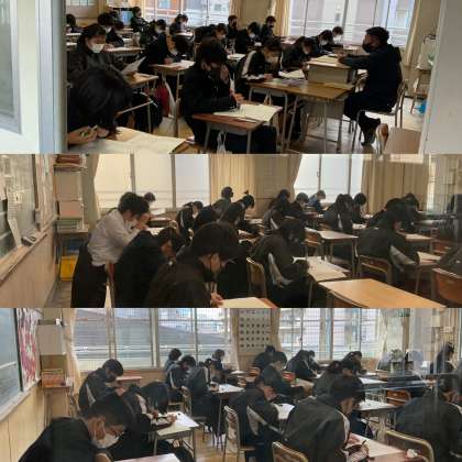 さて、今日(30日)は、2学期期末テスト2日目(1限…国語 2限…数学 3限…技術・家庭(1年のみ)/音楽(2・3年のみ))です。生徒の皆さんは、真剣な表情で取り組んでいますが、テスト時間の終わりまでしっかりと問題をよく読んで無回答がないように答えていきましょう。