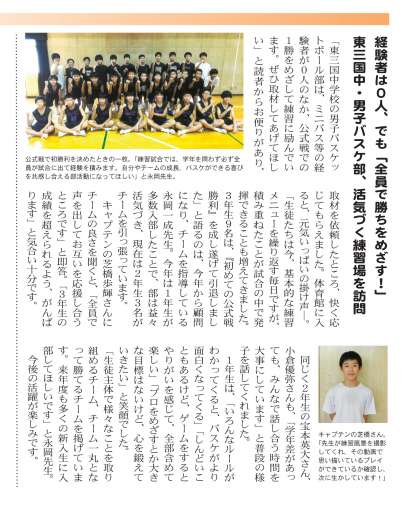 皆さんはタウン誌と呼ばれるものを知っていますか。私たちが住む大阪淀川区にある淀川区の今と昔と未来を結ぶコミュニティ新聞、「ザ・淀川」というタウン誌の12月号の9ページに東三国中・男子バスケ部のことが記事掲載されています。事前に取材依頼がありチーム写真やキャプテンのコメントのほか、経験者は0人、でも「全員で勝ちをめざす」、東三国中・男子バスケ部、活気づく練習場を訪問が記されています。機会があればぜひご一読いただければ幸いです。