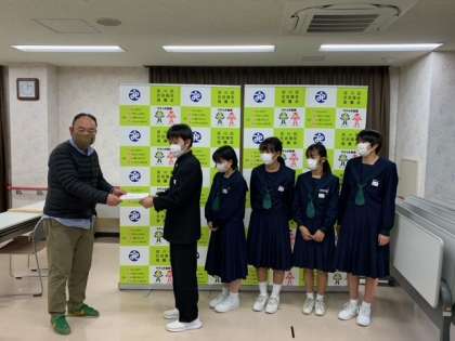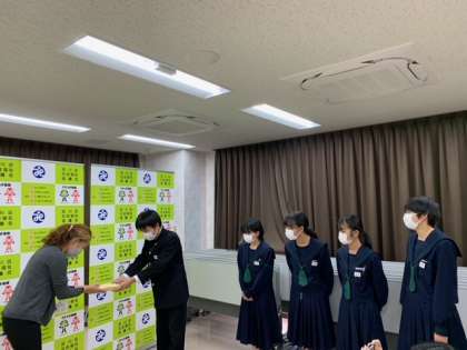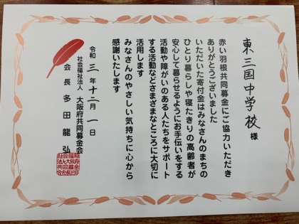 今日(1日)の放課後に生徒会会長を含め役員5名が生徒会担当の先生2名と淀川区社会福祉協議会を訪れて、11月9日から4日間行った赤い羽根共同募金、たくさんの方から募金をいただきましたので、集まったお金を社会福祉協議会事務局の担当者へ手渡してくれました。皆様から頂いた貴重なお金は協議会を通して、世の中の困っている方々へと皆様の心温まる思いとともに届けられることでしょう。本当にありがとうございました。なお、協議会から感謝状をいただきましたので、来週の全校集会で披露したいと思います。