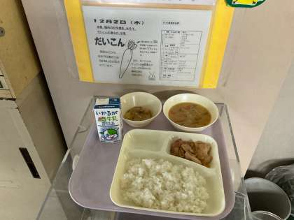 鶏肉の甘辛焼き みそ汁 だいこんの煮もの ごはん 牛乳