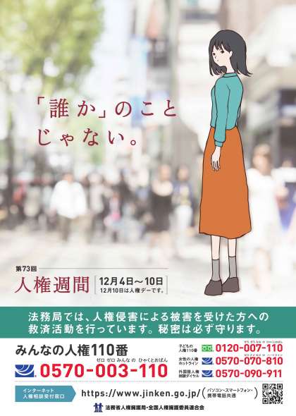 明日、12月4日(土)〜12月10日(金)は第73回人権週間で、人権デーは12月10日(金)です。国際連合は、昭和23(1948)年12月10日の第3回国際連合総会で「あらゆる人と国が達成しなければならない共通の基準」として世界人権宣言を採択されました。採択した12月10日を人権デーと定め、全ての加盟国及び関係機関に対し、この日を祝賀して人権活動を推進するための諸行事を行うように要請する決議につながりました。これをふまえ、この機会に改めて「人権」について考えてみましょう。