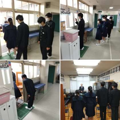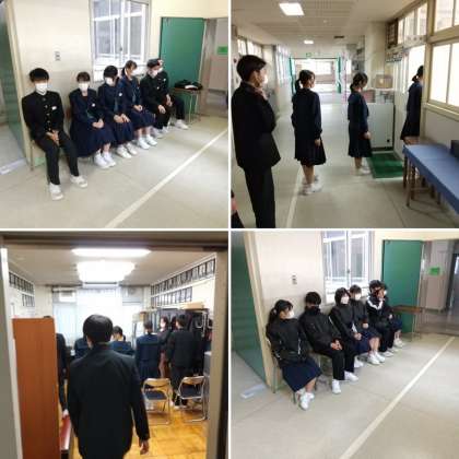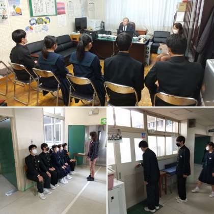 今日(7日)、5・6時限目に3年1組・3組のグループ面接を校長室にて行いました。学年でのマナー研修や面接の心得、マナー講座などを受けての校長面接ということもあり、程よい緊張の中で質問に答えていた人が多かったように感じました。時間の関係もあり、1グループ6・7名で、15分程度の練習となりましたが、初めて校長室へ入室した生徒も多くいたようです。全体に言えることですが、まず面接する人をしっかりと見ること。そして、質問に対しては、大きな声ではっきりと自分の考えを端的に伝えることを心がけてほしいものです。よく聞かれる質問もありますので、もう一度、担任の先生と今回の面接について一人ひとり振り返っておくべきだと思います。なお、2組は来週15日(水)を予定しています。また、本日の欠席者については後日、日を改めて実施します。来週以降に実施する予定です。
