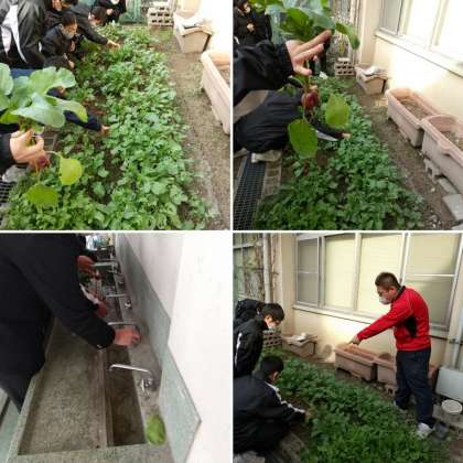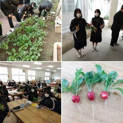 2年生の技術の授業では「生物育成に関する技術」について学習していますが、今日は待ちに待ったラディッシュの収穫です。生徒は大きくて質の良いものを収穫しようと考えるとともに、栽培記録を作成していました。自分たちが育てた野菜はどんな味がするか本当に楽しみですね。