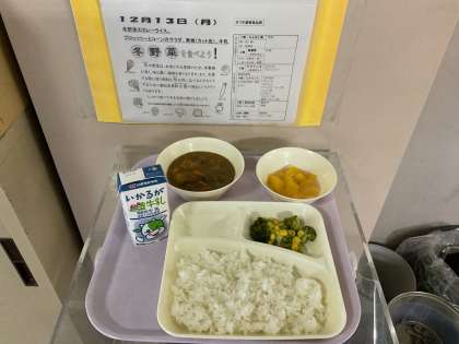 冬野菜のカレーライス ブロッコリーとコーンのサラダ 黄桃(カット缶) 牛乳